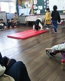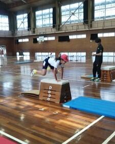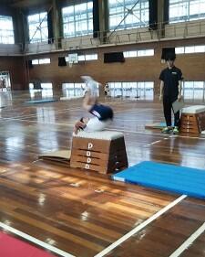 6年生が体育の時間に、跳び箱運動の発表会をしていました。自分が発表したい技を披露していました。