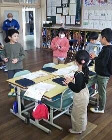 式の後、担任の先生は、クラスの子どもたちとお別れがありました。2年生は号泣でした。卒業生は、転出する以前受け持ってもらった先生にお礼を言い、転出する担任の先生にメッセージカードを渡していました。