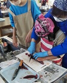 まずは、魚を3枚におろします。去年もしたから、6年生は慣れているようです。地域ボランティアの方が7名来られ、班に付いて教えてくださいました。