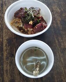 完成!羽釜で炊いたごはんと、魚の骨や使わなかった部分を出汁にした潮汁をつけて、おび天定食です。