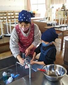 まず、先生の手順の説明を聞いて、自分が使う道具を洗いました。