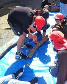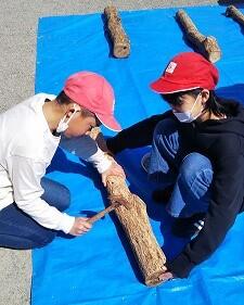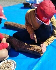 炊き上がるまで、今度はしいたけのこま打ちをしました。これも、ボランティアの方に教えていただきながら、ドリルで穴を開け、そこに菌の付いたこまを金槌で打っていきました。