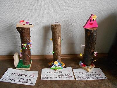 3年生の図工では、金づちを使った工作を行いました。木の幹にくぎを打ちつけて作ります。くぎといっしょにビーズなどの飾りもつけました。堅い木の幹にくぎをうちつけるのは大変な作業で、とちゅうで曲がったり、はずれてしまったりしていました。金づちを使った工作をしたことがある子もいて、力強くトントンくぎをうちつけていました。くぎうちはとても楽しかったようです。どの子も完成した作品に満足の様子でした。家に持って帰ったら、カギかけに使って