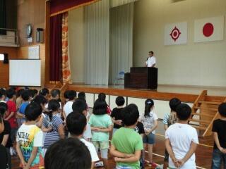 式の後は、スポーツ少年団の表彰や来月途中で学校を去られる先生のお別れのお話、さらに、夏休みの過ごし方について係の先生方からのお話がありました。