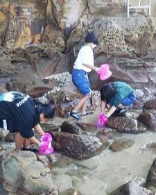 【磯の生き物観察班】 なかには海に入ってずぶ濡れの子も・・・(もちろん服の下に水着を着ています。)