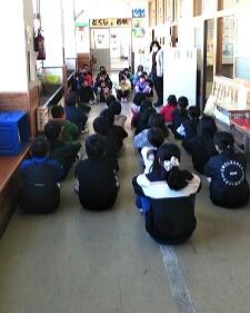 まず、全校で目井津子守船歌を3年生のパフォーマンス付きで歌い、ボランティアの方々の紹介、児童代表あいさつ、4年生の合唱・合奏のプレゼントを行い、最後にボランティア代表の方にお話をしていただきました。
