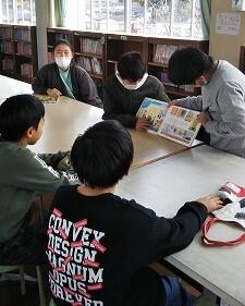 昼休みに図書委員会が、図書室に来た人に読み聞かせをしていました。読む方も聞く方も楽しそうでした。