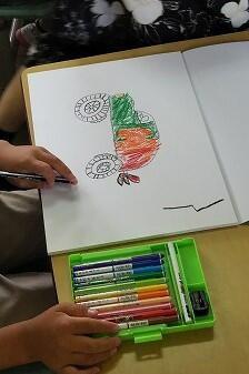 贈呈式では、日南市の教育長先生から代表の児童がスケッチブックをいただきました。その後、1年生が教室で思い思いに描きたいものを描きました。