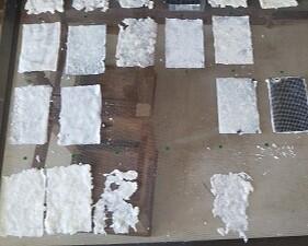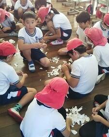 3年生が紙すきをしました。牛乳パックの表面のフィルムを剥がして、細かくちぎって、それをミキサーに入れて、それでも大きいかけらをちぎって、それから紙すきをしました。