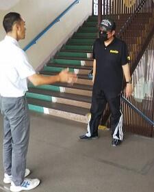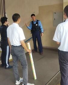 不審者が校舎の2階にあがって来る想定で、気付いた職員が対応し、その間に事務室に連絡→緊急放送→職員が取り押さえる、という流れでした。不審者役の先生の迫真の演技で、とても緊張感がありました。