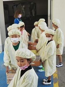 当番は受け取って給食室前で並んで、先頭の子が「○年○組、出発します。」と言うと、みんなで「はい。」と元気よく返事をして教室に向かいます。