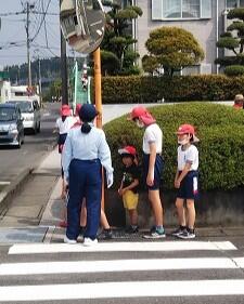 毎年この時期に、実際に学校周辺を歩いて横断の仕方等を学ぶ交通安全教室を行っています。学校周辺には線路があります。信号機のある横断歩道や信号機の無い横断歩道があります。狭い路地の交差点もあります。実際にその現場で指導を行いました。子どもたちの安心・安全のためです。手を挙げて横断歩道を渡ること、止まって左右の確認をすること等を指導しました。日常の生活でも生かしてほしいです。