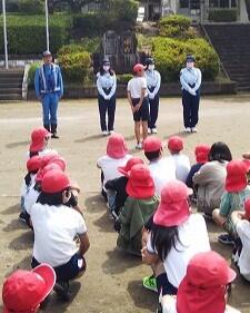 交通安全教室を行いました。日南警察署から4名(白バイ隊の方1名、交通指導員3名)に来ていただきました。