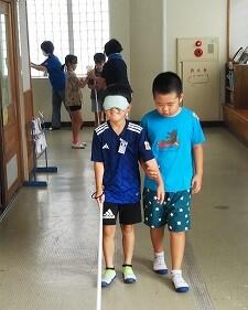 アイマスク体験では、白杖をもって廊下や階段を上がりました。視覚情報のないことの大変さを知りました。