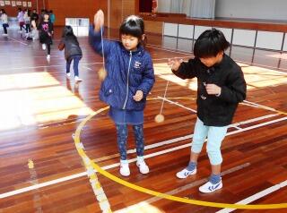 1年生は,1月17日(火)と1月18日(水)に,生活科の学習で昔の遊びを体験しました。体育館で,けん玉,こま回し,なんこ,おはじき,おじゃみ,羽根つき,だるま落としなど,たくさんの遊びを体験しました。日頃遊んだことのない物ばかりで,遊び方が分からないようでしたが,遊び方を教わると夢中になって取り組んでいました。来週,地区の方々と昔遊びを行います。子どもたちは,今からとても楽しみにしています。