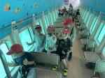 船に乗った後は船内を自由に移動してよいとのことだったので、下の海中デッキに行ったり、備え付けられた双眼鏡をのぞいたりしていました。外洋に出ると少し波が出てきて船が大きく揺れるようになりました。「もうすぐ魚や珊瑚礁が見えます」と船内放送が入るとガラスに張り付いていました。