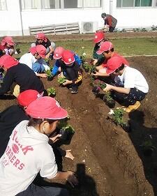 2年生と3年生が、花壇に花を植えていました。