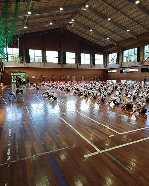 運動会の全体練習をしました。今朝は曇りでしたが、昨日の大雨運動場が使えず、体育館で行いました。最後の全体練習だったのですが・・・。