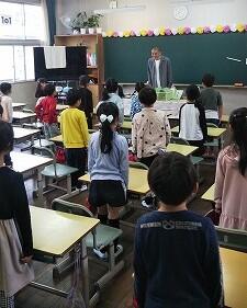始業時刻になって、1年生の教室に行ってみると、朝のあいさつの練習をしていました。先生と一緒に元気にあいさつをして、先生のお話を聞いていました。