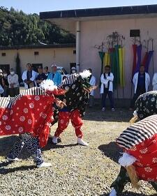 栄松地区の4・5・6年生が獅子舞と浦安の舞を奉納しました。午前中に神社を出発して地区のいろいろな場所で舞い、最後は神事が公民館であり、神事の後舞いました。