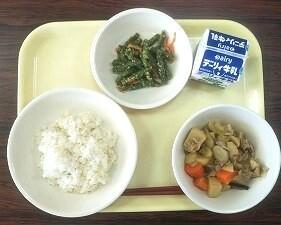 麦ごはん、豚肉と厚揚げのみそ煮、いんげんのごま和え、牛乳
