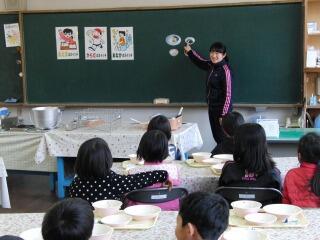 本校には給食室の近くにランチルームがあります。各学級定期的にランチルームで給食をとります。食後には、栄養士の先生から食に関する話をしていただきます。先日は、2年生が朝食の大切さについて学びました。