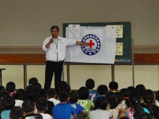 昨日、青少年赤十字の登録式を行いました。バッジを授与していただき、赤十字の歴史や活動内容について話をしていただきました。