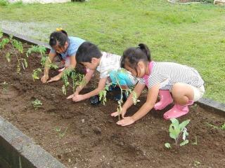 1年生教室の前には学年園があります。現在は生活科で学習するための野菜が数種類植えられています。今年は雨が多いようですが、大きく育ってほしいですね。