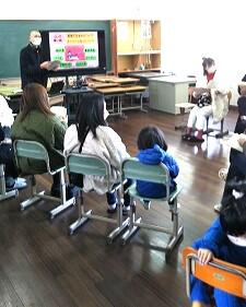 防災学習では、本来は日南市危機管理課の方に来ていただいて、講話と簡易テント・ベッドの作り方を親子で体験する予定でしたが、昨夜の津波注意報を受けて、講師の先生がその対応のために来られなくなったので、内容を急遽変更しました。校長の話と防災についてのDVD視聴を行いました。
