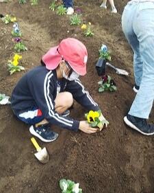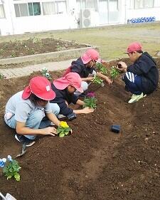 4年生と5年生が、花壇に花を植えていました。丁寧にきれいに植えていました。