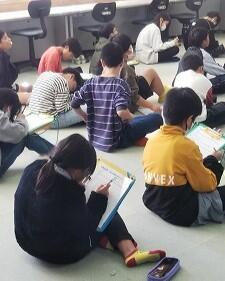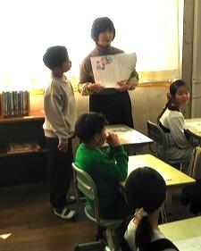 もう1クラスは、冊子を先生の範読で読みました。クリーン作戦の内容だったので、毎日昼休みのごみ拾いボランティアをしている子にインタビューしました。