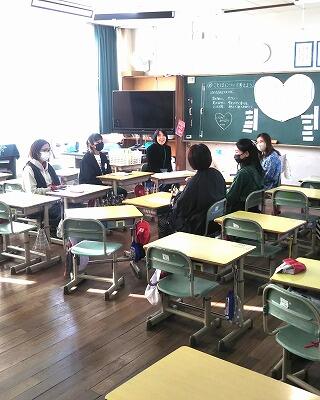 6年生がキャリア教育で職業についてのお話を聞きました。「よのなか先生」として、にじ色の海こども園の園長先生を講師に招いて、保育というお仕事について話をしていただきました。