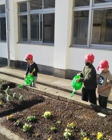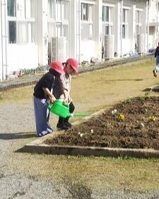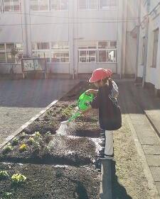今日も1年生が花壇に水をかけていました。1年生の花壇だけでなく、他の学年の花壇にも水をかけていました。