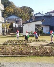 1年生の花壇は花と野菜が植えてあります。今日、囲いがついていました。おそらく1年生の先生です。ニラとたかなを寒さから守っているようです。子どもたちと一緒に育てたい、一緒に食べたいという思いの現れだろうと思います。