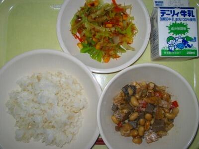 グルメレポート:五目豆は、いろんな具が入っていておいしかったです。おかか和えは、キャベツがさくさくしていておいしかったです。(2年3組児童 S)