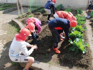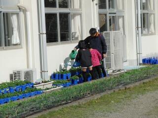 本校では学年の花壇があり、それぞれの学年が次年度を見越して花や野菜を育てています。日常では、朝登校した時に靴箱に行く前に花壇の様子を観察したり、昼休みに雑草抜きや水やりをしたりする姿が見られます。子どもたちは、生き物に関心をもって大切に育てています。