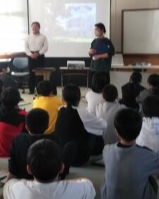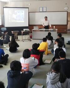 6年生がキャリア教育で職業についてのお話を聞きました。「よのなか先生」として、にじ色の海こども園の園長先生を講師に招いて、保育というお仕事について話をしていただきました。