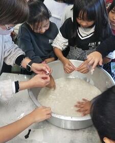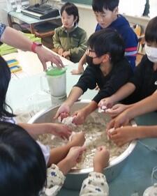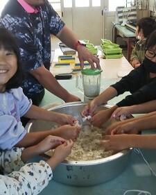 3年生が紙すきをしました。牛乳パックの表面のフィルムを剥がして、細かくちぎって、それをミキサーに入れて、それでも大きいかけらをちぎって、それから紙すきをしました。
