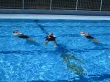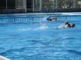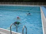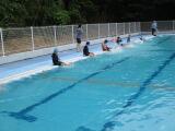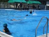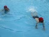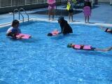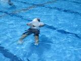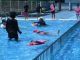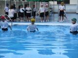 1・2年生が、小プールで着衣泳の学習をしました。水着の上に着た体育服が重く、なかなか前に進まないことを体験したあと、ペットボトルを胸に抱え、口や鼻を出して長い時間浮くことができることを体験しました。
