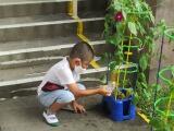 1年生が、毎朝、アサガオの観察をしています。水やりをしながら、花やつぼみの数を数えては、「〇つ咲いた!」と言って、教えてくれます。今日も、登校後、すぐに水やりをして、興味津々の笑顔で観察をしていました。