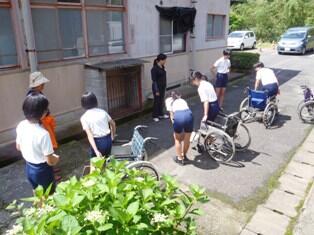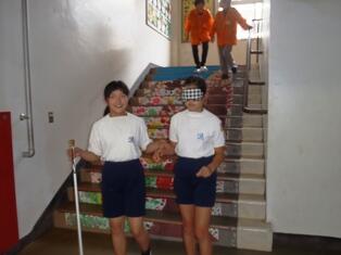 目隠しと杖で校内を歩いたり、車椅子に乗ったり、装具をつけて高齢者体験をしたりしました。