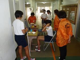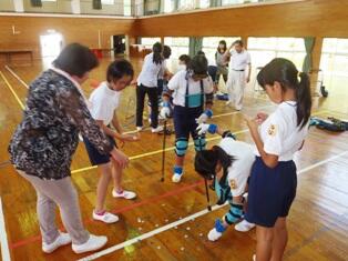 社会福祉協議会の皆さん、ボランティアの皆さんの協力で、ハンディキャップ体験を行いました。