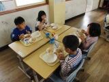 今日から1年生の本格的な学校生活が始まりました。登校後は、ランドセルなどの持ち物をロッカーに入れるところから担任の先生に教えてもらい、1日が始まりました。初めての給食は、ポークカレー、フルーツポンチ、牛乳と、1年生が喜んで食べられるメニューで、みんなおいしそうに食べていました。