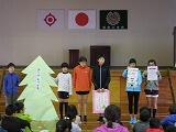 児童会からは、12月の目標「思いやりの心をもとう」について、「ありがとう の木」の取り組みや「呼び捨てをなくそう。」というめあてについて呼びかけていました。その他、募金運動やペットボトルのふたの回収についても協力のお願いをしました。