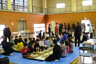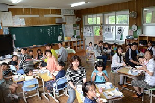 手作りのお弁当を仲良く食べる児童
