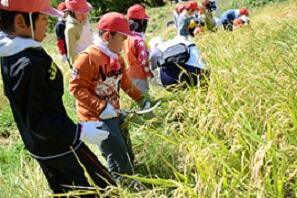 稲刈りの後,5・6年生とJA青年部の方々との