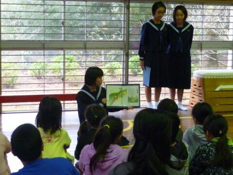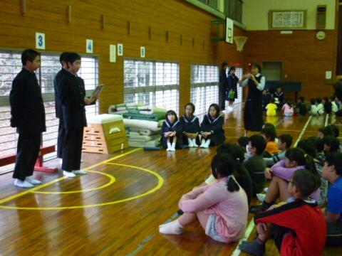 今朝、体育館において、榎原中学校の生徒による読み聞かせがありました。低・中・高学年の3つのグループに分かれて、読み聞かせや本の紹介などがあり、小学生も感想を発表していました。心温まる活動でした。