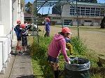 登校後、朝の準備をしたら「おはようございます。後、何分あるかな?」と言いながらボランティアをする子どもたちです。草をとって花壇をきれいにしていました。