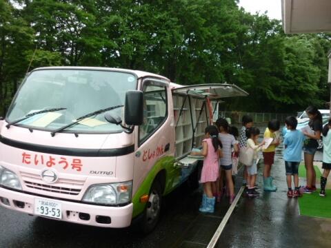 月に2回、日南市立図書館から「たいよう号」がやってきます。子どもたちは、毎回来るのを楽しみに待っています。今日もたくさんの本を借りていましたよ。