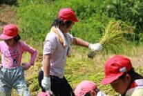 JA青年部の方に稲の刈り方を教えて頂き、みんなで一生懸命刈りました。